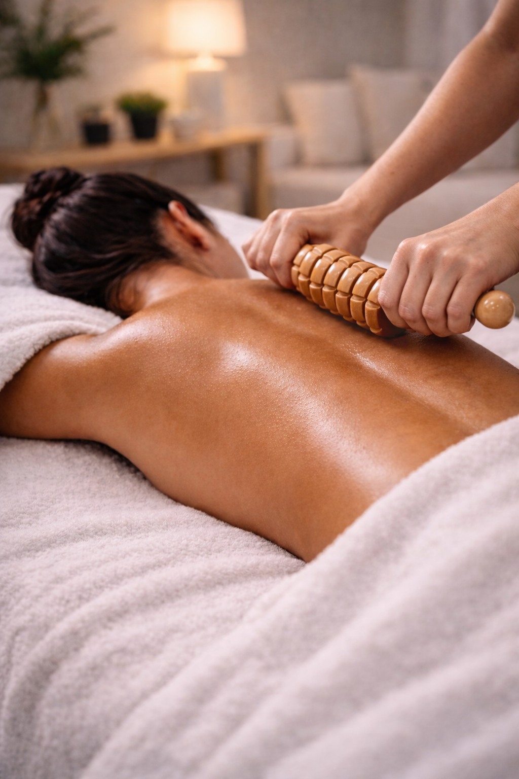 تقنية مساج متقدمة تُستخدم فيها أدوات خشبية مصممة خصيصاً لتحفيز الجسم، شدّ العضلات، وتنشيط الدورة الدموية واللمفاوية.