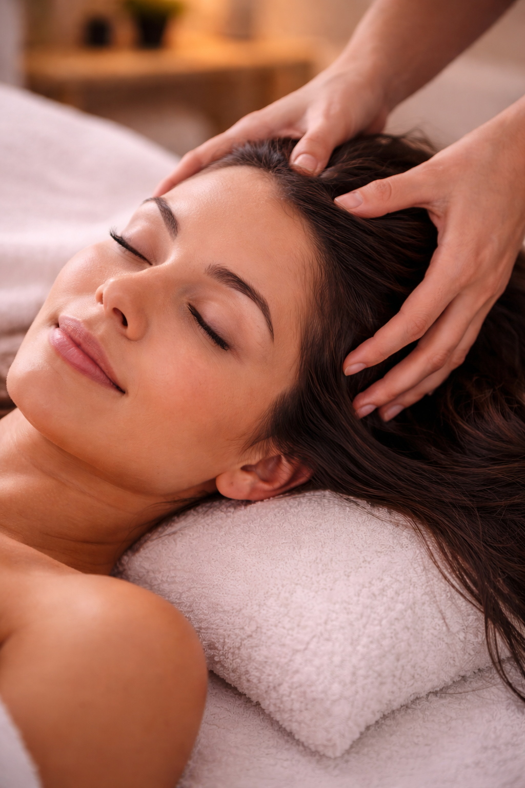 جلسة استرخاء مركّزة تهدف إلى تخفيف التوتر والضغط الذهني من خلال حركات ناعمة ومدروسة على فروة الرأس.